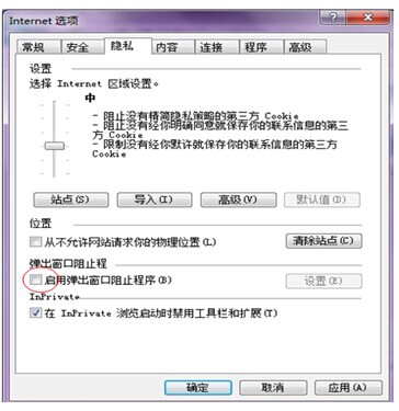 IE浏览器菜单栏——》工具选项下“Internet选项”——》隐私选项卡中将倒数第二个复选框“启用弹出窗口阻止程序”取消勾选,最后点击【确定】。效果如下图: