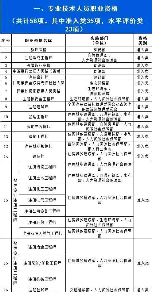 国家职业资格目录专业技术人员职业资格59项,含准入类35项(会计从业资格认定已于2017年取消),水平评价类24项;技能人员职业资格81项,含准入类5项,水平评价类76项。